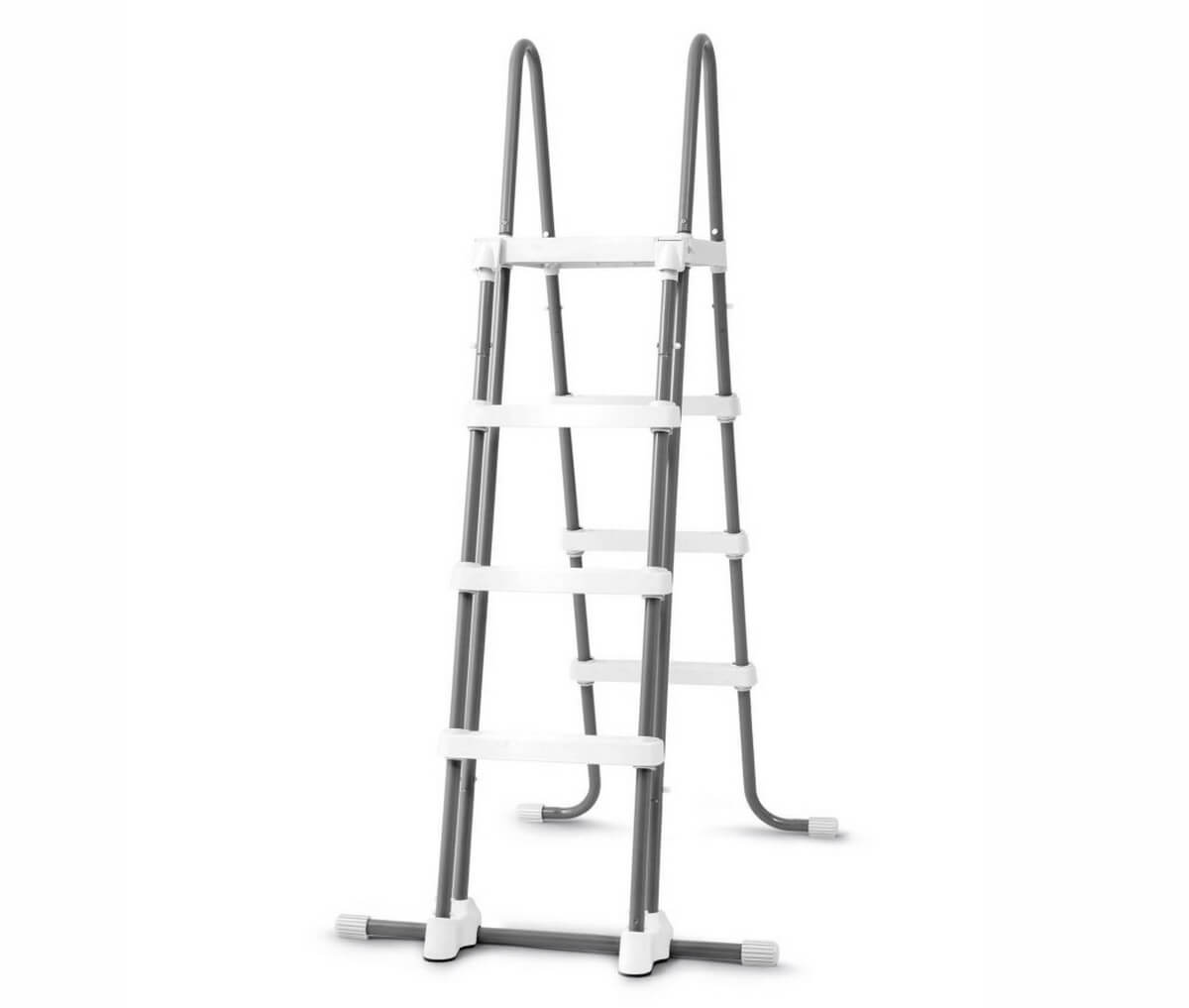 Усиленная двусторонняя лестница Intex 28076 для надувных и каркасных бассейнов высотой до 122 см. Выполнена из металлических стоек с покрытием из порошкового напыления от ржавчины и истирания. Лестница оборудована съемными ступеньками, которые быстро снимаются и устанавливаются в вертикальное положение, когда бассейн не используется. Это необходимо для ограничения доступа к бассейну детям. Ступени выполнены из усиленного пластика. Лестница довольно простая в использовании, она долго хранится и имеет длительный срок эксплуатации.